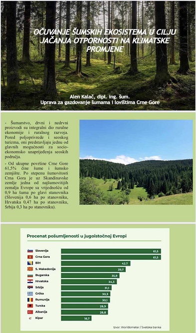 U okviru treće teme „Očuvanje šumskih ekosisitema u cilju jačanja otpornosti na klimatske promjene“, gospodin Kalač je istakao krucijalni značaj šuma u borbi protiv klimatskih promjena, kao i značaj institucionalnih, tehničkih i mjera informisanja. On je opisao ulogu urbanih šuma i predstavio koncept klimatski pametnog šumarstva. Na kraju, istakao je i važnost NATURA 2000 mreže u zaštiti i unapređenju šumskih ekosistema. Zaštita šumskih ekosistema mora biti imperativ svakog pojedinca.